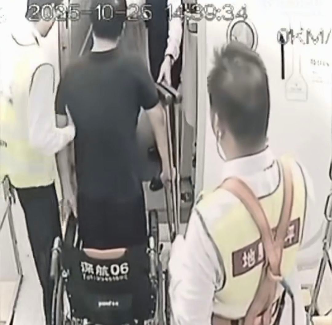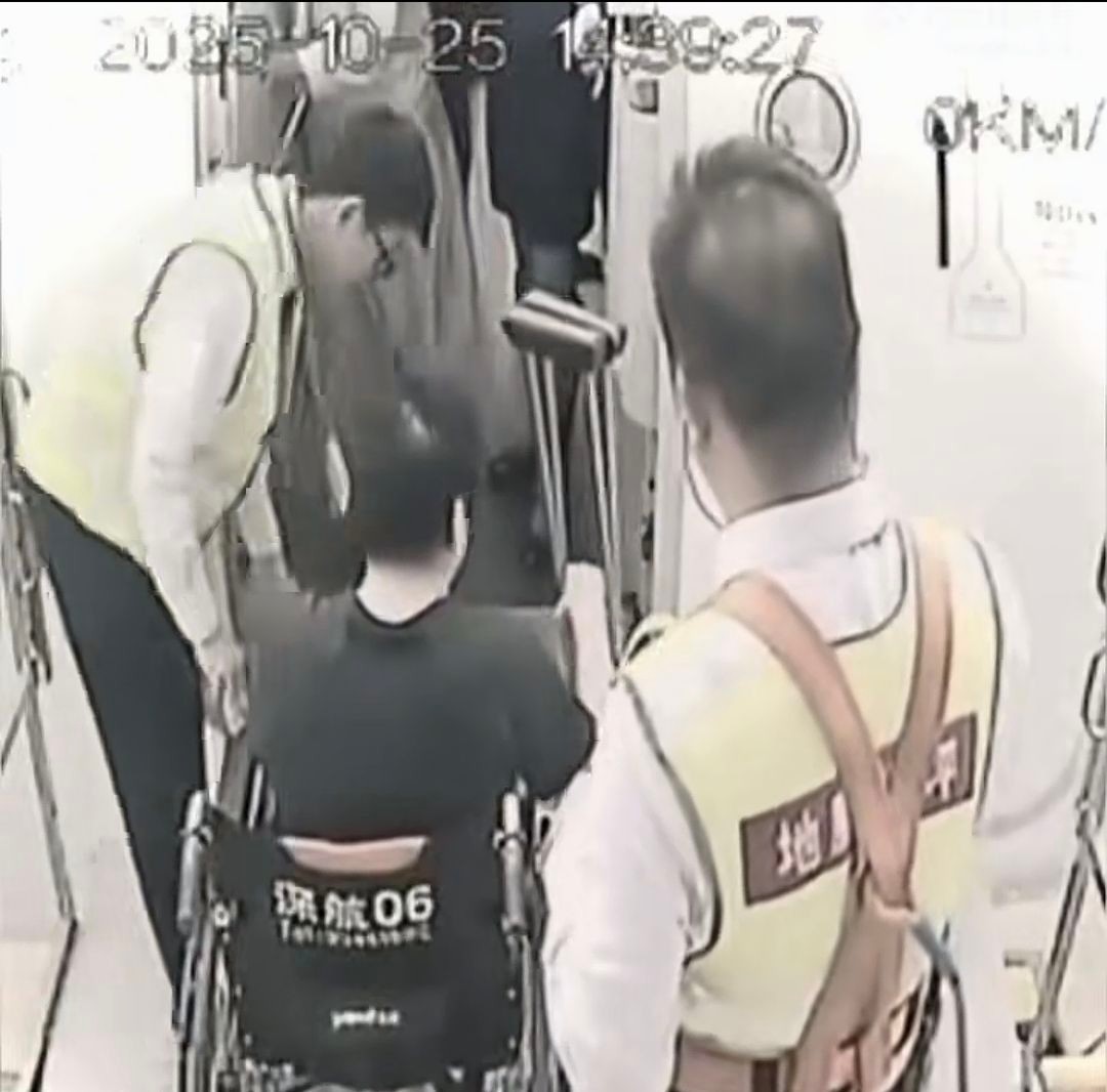 8. 视频清晰显示,整个登机过程有两名工作人员全程协助,并非如其所述无人问津。左侧一名年轻男子躬身托扶郑智化的腿部,右侧工作人员则稳稳顶住轮椅背部,防止滑动,直至他安全踏入舱门内侧才撤离设备。同时,舱门口还有两位空乘人员等待接应,姿态认真且耐心。