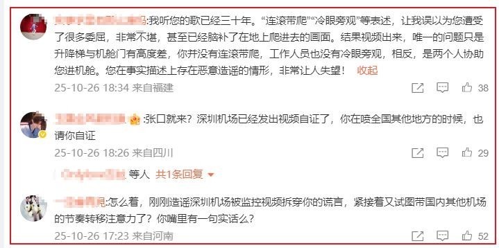 10. 一位资深歌迷表达强烈失望:“我听您的歌已三十年。‘连滚带爬’‘冷眼旁观’这样的措辞让我以为您遭受了极大屈辱,甚至想象您在地上艰难爬行的画面。结果视频显示,只是升降平台与机舱之间存在轻微高度差,全程都有人帮扶。您在事实陈述上明显夸大其词,近乎造谣,这让我非常心寒!”